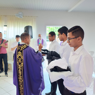 Após as apresentações foi celebrada a Santa Missa em ação de graças, presidida pelo Revmo. Pe. Ramon Lima, reitor da instituição. Houve a Investidura da Batina e envio para o Seminário Maria Mater Ecclesiae, São Paulo, onde farão os cursos da Filosofia e Teologia.