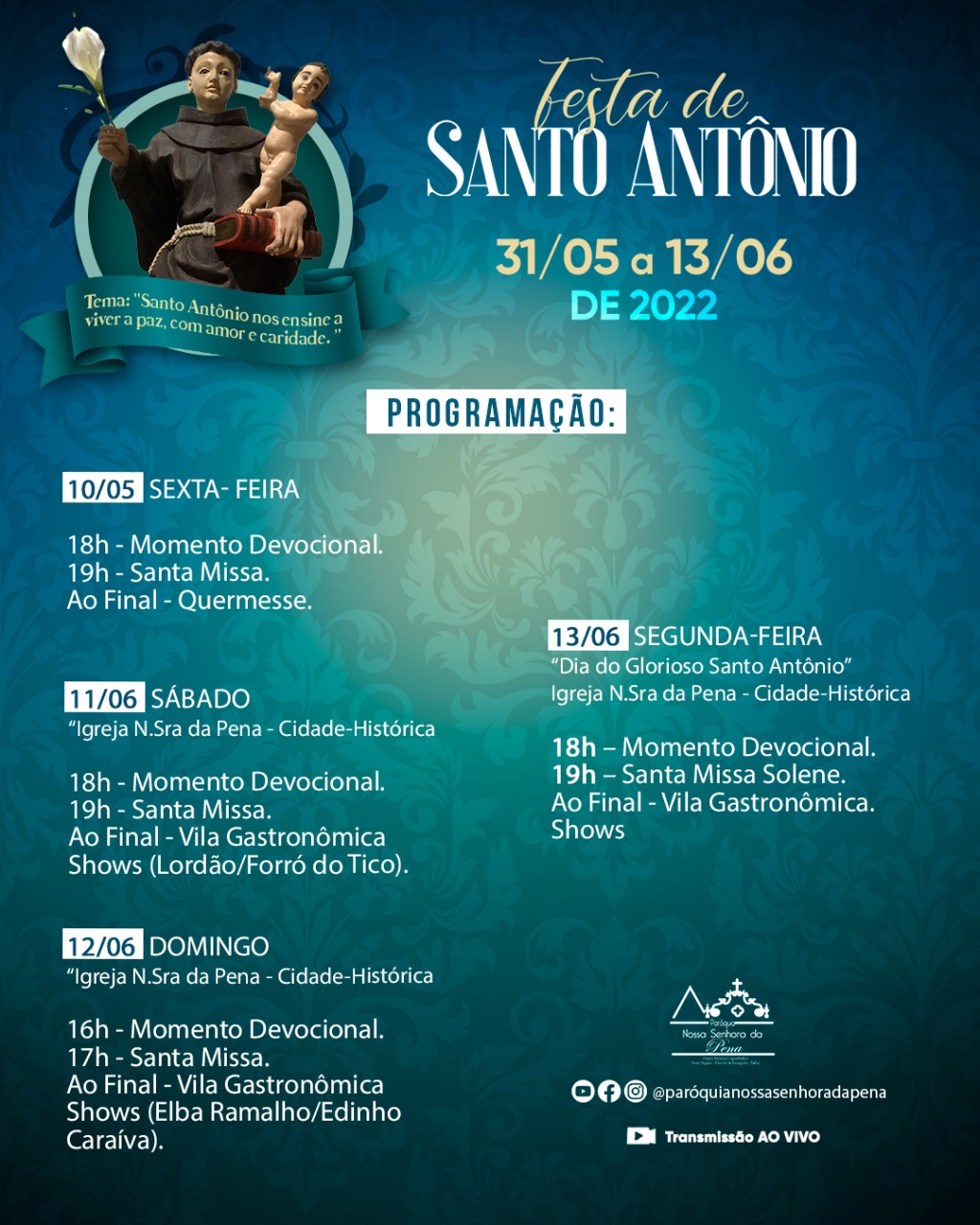 A Paróquia Nossa Senhora da Pena promove as tradicionais celebrações em Honra a Santo Antônio, marcando de forma especial o inicio dos festejos juninos. Serão missas, procissões e celebrações que começam na Terça-Feira, em 31 de maio, e seguem até o próximo dia 13 de Junho.